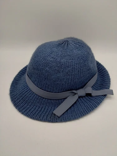 Vintage Marshall Fields Women's Knit Blue Gray Hat Ribbon Trim