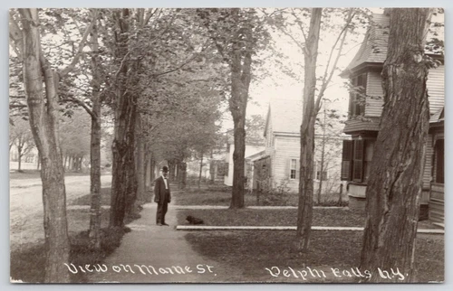 Delphi Falls NY View on Main Street RPPC Old Houses Man in Bowler Hat