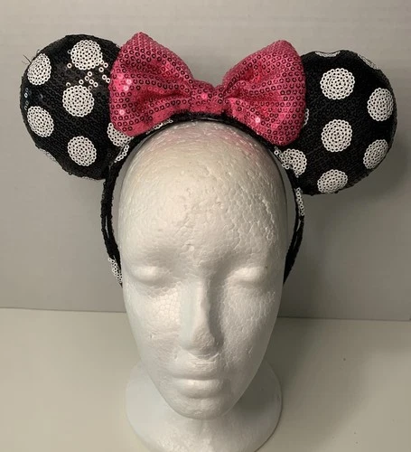 Pink Bow Polka Dot Mouse Ears Black White Sequin Minnie Style Headband