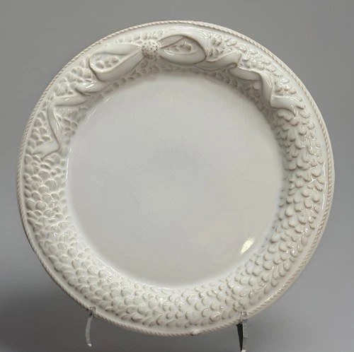 Juliska Ceramics Boxwood and Bow Dinner Plate White Embossed Beautiful