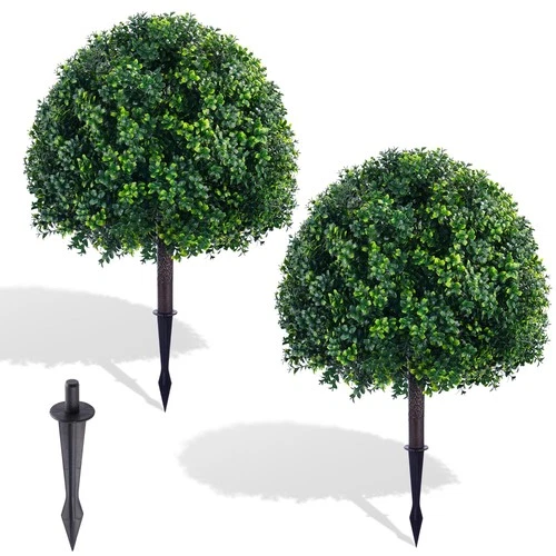28 Inch Artificial Boxwood Trees, 2 Sets Faux Boxwood Topiary with Spikes, Po...