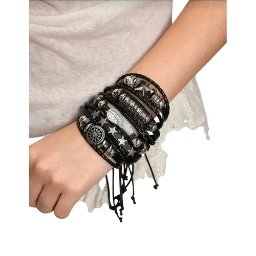 Black Faux Leather Multi Layer Bracelet Set Silver Star Wing Charms Adjustable