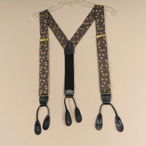 Mens Silk Suspenders Geometric Leather Button On Adjustable Vintage 90s USA