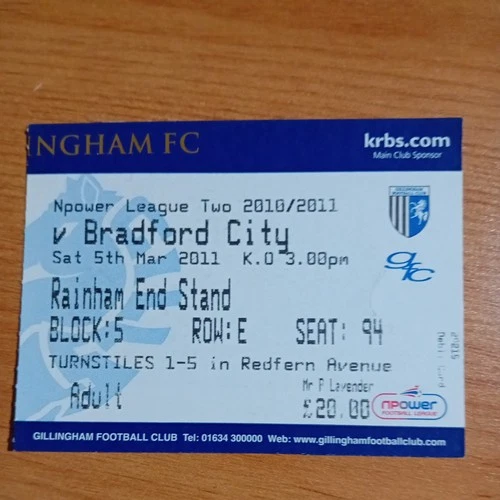 Ticket : 2010/2011 5/3/2011 L2 Gillingham v Bradford City