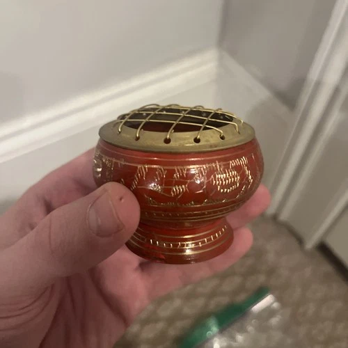 India Small Decorated Brass Charcoal Screen Incense Burner with Wooden Coaster