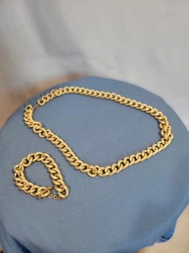 Big Vintage Chunky Chain Wide Gold Tone Textured 24” Necklace & 7” Bracelet Set