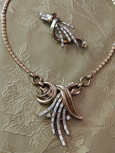 Trifari Alfred Philipe Pat.1949 Meteor Gold Plated Necklace & Brooch Jewelry Set