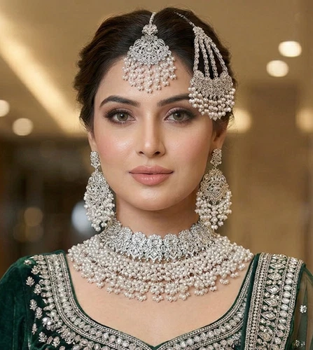 Traditional Silver Plated Kundan Bridal Jewelery Set With Earrings & Tikka