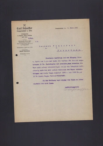 Tangermünde, letter 1921, Carl Schaeffer coal-coke-briquette-wholesale