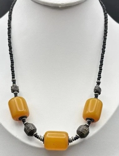Vintage Butterscotch Bakelite Bead Necklace Bronze Accents