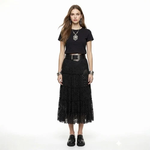 Vintage Lillie Rubin Black Lace Broomstick Skirt 4 Rhinestone Whimsigoth Midi