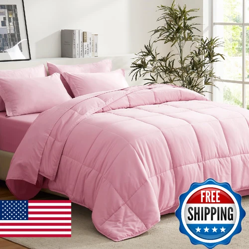 COZYART Full Comforter Set 7 Pcs, Pink Bed in a Bag, All Season Lightweight Soft