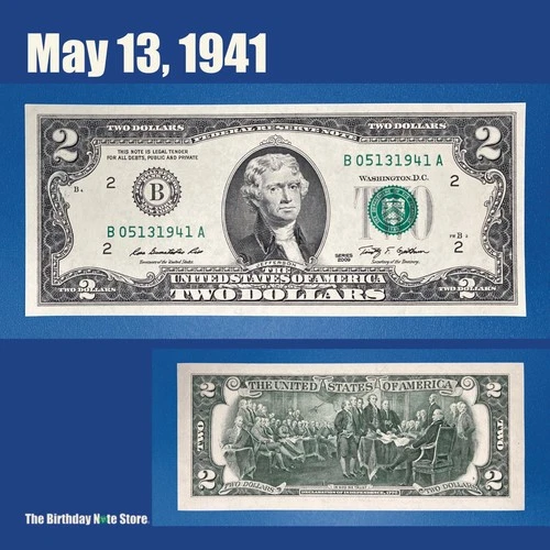 May 13, 1941 Birthday Anniversary $2 Two Dollar Bill Serial Number 05131941