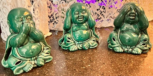 Vtg Smiling Buddha jade Green 3 Statue Figurine potpourri sachet holder Ceramic