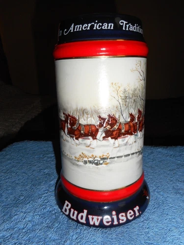 Vintage Budweiser Beer Clydesdale Horses Winter Hitch Mug 1990 SUSAN SAMPSON