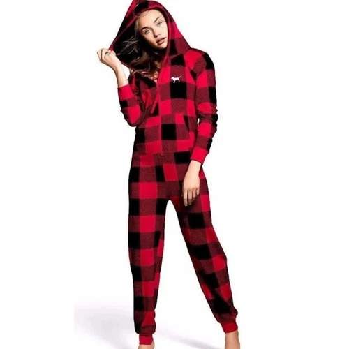 Victoria Secret PINK Red Buffalo Plaid Hooded Sherpa Long Jane One-Piece PJ XS