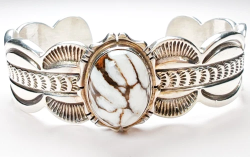 Navajo Sterling Silver White Buffalo Turquoise Cuff Bracelet • 46.64g • Signed M