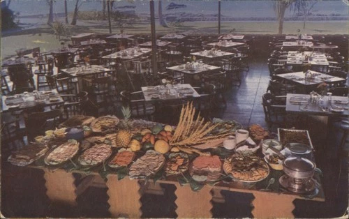 Kailua, Hawaii HI Kona Inn Dining Lanai, Buffet Spread 1950 Chrome Postcard