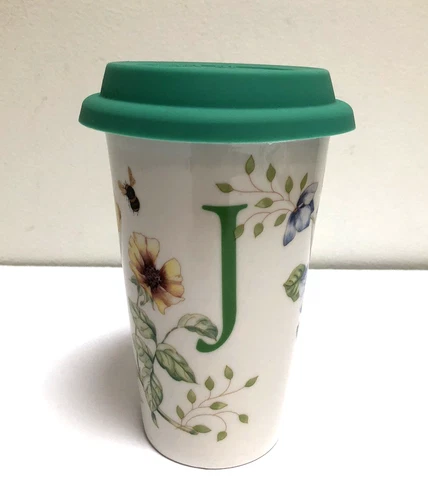LENOX Butterfly Meadow LETTER J Tumbler 12-ounce Porcelain w/Lid Travel Mug
