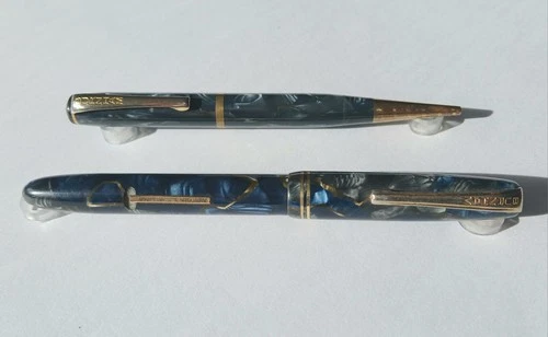 Vintage Burnham Fountain Pen No 54 and Pencil Marbled Blue Grey Brown 14k nib