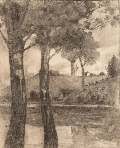 I. WINTER (20th Century), Trees by the Water, Charcoal Realism Landscape 1850-1899 Drawing