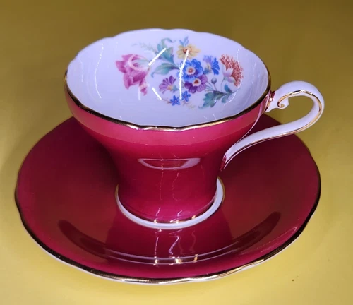 Aynsley Cabbage Rose Floral Corset Tea Cup & Saucer Set Maroon Red C332 Enamel