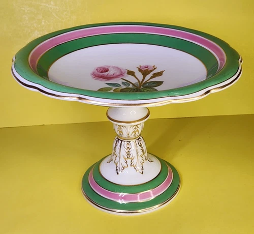 Antique English Davenport Porcelain Tazza Compote Pink Cabbage Rose Gold Green