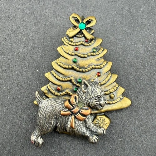 Vintage Christmas Dog and Tree Brooch Pin Cairn Terrier Scottie Mixed Metal