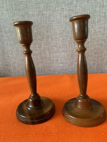 Pair of arts and craft walnut and brass candlesticks