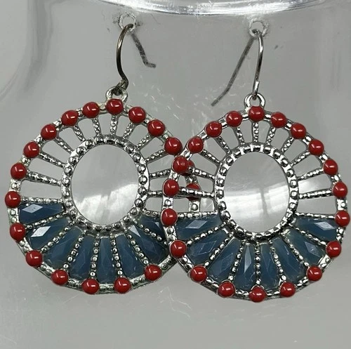 Vintage Y2K Red Blue Beaded Hoop Earrings Silver Tone Fan Style Boho Statement