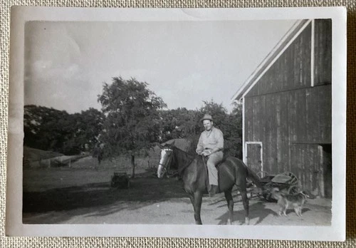 Vtg Photo Man Barn Horse Dog Collie Cart Dirt Road Farm Dirt Road B&W 4.75"x3.25