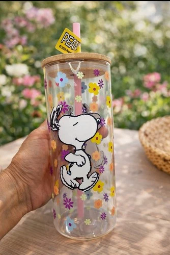 Snoopy Floral Acrylic Tumbler Bamboo Lid Pink Straw 20oz Cup