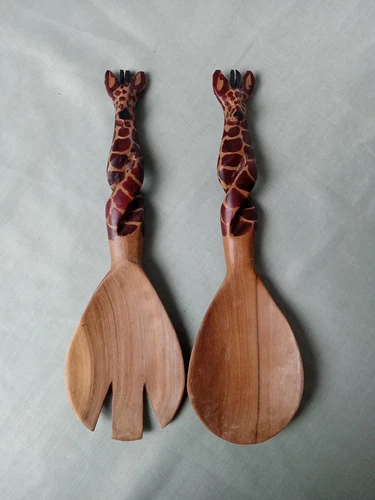 Kenya Artisan Hand-Carved African Giraffe 9" Wood Fork Spoon Salad Server Set