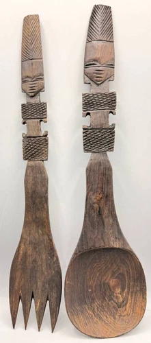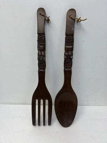 African Hand Carved Wood Fork Spoon Set 14" Tribal Wall Decor Vintage