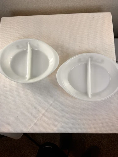 (2) Glasbake Oval Divided Milk Glass Casserole Baking Dish Handles Green Daisy