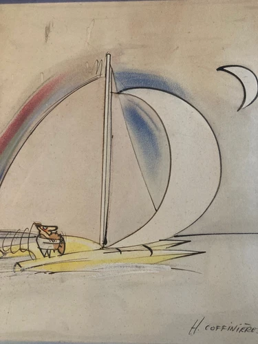 Beautiful Drawing Hervé Coffinier Humor Boat Sea Catamaran Watercolor 1980 Art