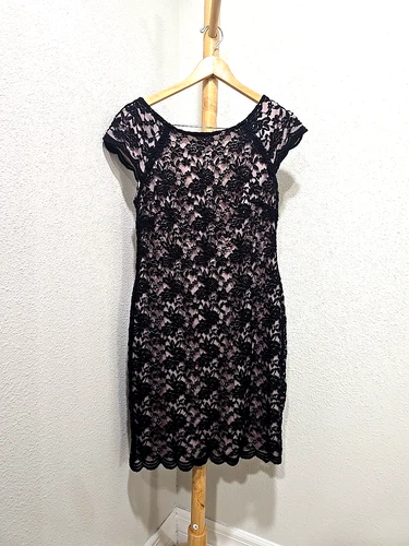 Black Lace Overlay Pink Cocktail Dress Sz 12 Stretch Cap Sleeve Whimsigoth Party