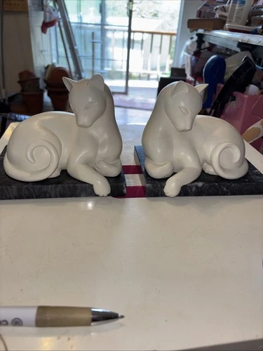 Vintage Pair White Stone Siamese Cats Black Marble Art Figurine Book Ends