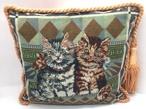 Cat Pillow Stitched Gold Rope Edging Kittens Tapestry snuggling
