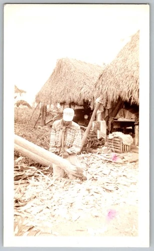 Vtg B&W Snapshot Man Farm Labor Hat Thatch Roof 1950s