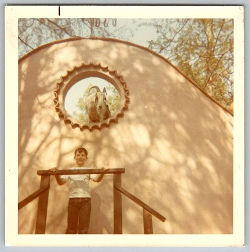 Vtg Color Snapshot Boy With Goat On Roof 1960s