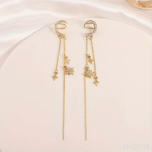 Gold Tone Crescent Moon Ear Cuff Star Chain Threader Earrings Celestial Jewelry