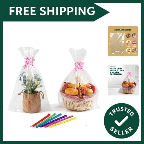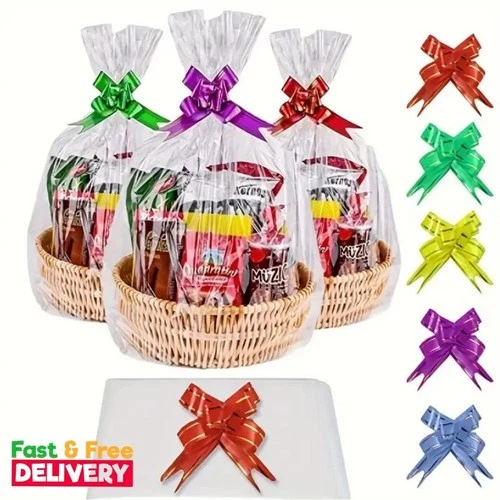 20/50 piece large clear cellophane bag with bow for basket and gift wrap christm
