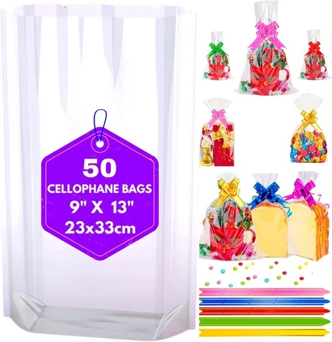 Cellophane Bags, Pack of 50 (9"X13"/23X33CM) Medium Clear Sweet Bags with Bows