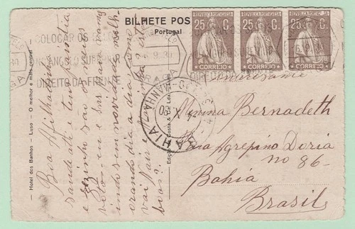 PORTUGAL 3x25c Gray CERES on 1930 [Sp16] PPC BRAGA to BAHIA BRASIL Slogan Cancel