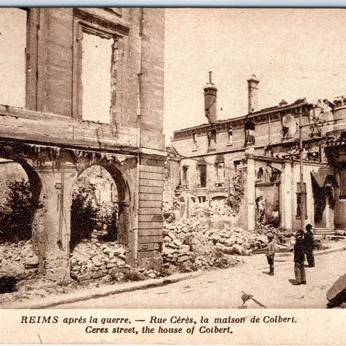 c1918 Reims, France Postcard Rue Ceres WWI Colbert House War Ruins Men A374