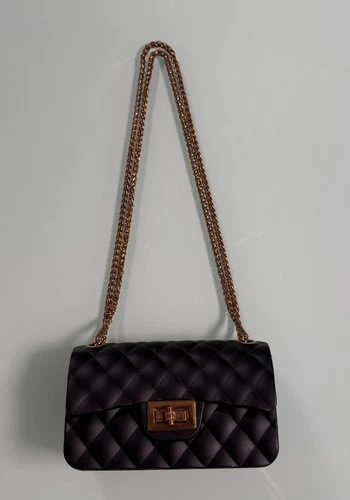 Small Quilted Crossbody Bag Black Faux Leather Gold Tone Chain Strap Turn Lock