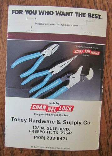 MATCHBOOK: TOBEY HARDWARE (FREEPORT, TEXAS) (CHANNELLOCK TOOLS) MATCHORAMA -F17