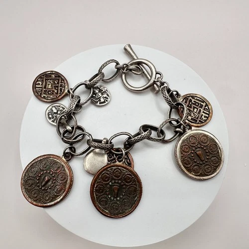 Vintage 90s Coin Charm Textured Bracelet Boho Silver Tone Statement Jewelry