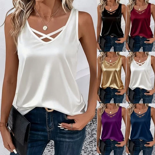 Womens Summer Cross Neck Satin Silk Tee Shirts Tops Loose Blouse Cami Vest Tanks